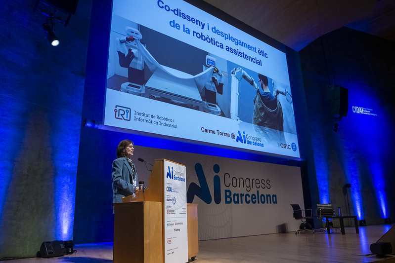 En aquest sentit, un dels àmbits més presents al congrés va ser el de les aplicacions de la IA al camp de la medicina, un bon termòmetre per saber què s’està fent, però també (i sobretot) com s’està fent. Així, per exemple, va destacar la conferència de Carme Torras, investigadora del CSIC-UPC, que, a més, va rebre el reconeixement de l’AI Congress a la trajectòria científica i professional (amb ovació inclosa del públic assistent). Torras va explicar el paper de la intel·ligència artificial en la robòtica assistencial, amb exemples pràctics que permeten situar-la en el món real i comprendre el potencial d’aquesta tecnologia per posar-la al servei de les persones. La imatge d’un robot d’última generació recordant la pauta de medicació a una àvia de 90 anys impacta tant pel seu caire futurista com per la convivència de dues generacions tan allunyades en el temps i ara unides per la tecnologia.